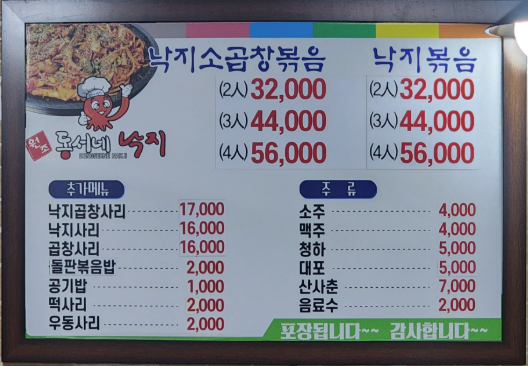 | 볶음밥 | ₩2,000 | 낙지와 곱창 양념의 마무리로 꼭 추천 |